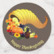 Beautiful horn of plenty with pumpkin, fruits and autumn leaves on light beige and brown Table Confetti.