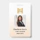 A badge for makeup artists, nail designers, hair stylists, designers, beauty salon owners. A beige and white gradient background. Add your photo, title, company logo,