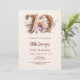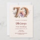 A modern, stylish and glamourous invitation for a 70th birthday. Beige, cream coloured background, decorated with a peach and purple watercolored flower. The name is written with a modern hand lettered style script. Personalise and add your party details. Number 70 is written with a balloon style font, script.