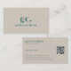Elegant minimalistic professional business card with beige organic craft paper texture background. Customisable text in botanical green with a QR code for additional information.