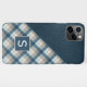 Contemporary tan, brown, beige, taupe, and dark teal blue coloured tartan plaid, and a faux leather texture pattern background. With room to customise or personalise with a name monogram or initial of your choice. Beautiful, modern, and cool cover for the trend-savvy and art-loving hip trendsetter, artsy motif lover who wants to protect their phone from dust and dirt, wear and tear. This design is available in Apple iPhone 6, 7, and 8 Plus, 10 or X, XR, XS, 11, 12, 13, 14 Mini, 15 Plus, and Pro Max cellphone cases. Show off your style, look fashionable, and feel stylish with a unique design on a mobile device accessory of your choice.