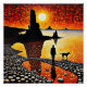 A.I. assisted print of a person and a dog walking along a pebbled beach, silhouetted against a vibrant orange sunset while another standing on a distant rocky outcrop observes them.
