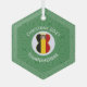 Christmas decor featuring an angel dressed in the flag of Belgium on this hexagon glass ornament for the holidays. The Belgian angel flies inside a circle of white squiggly squares, surrounded by a background of green squiggly squares for Christmas. To personalize, add a name. To customize, add a year. Or, add your own text.