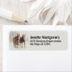 Christmas return address lables an outdoorsy photograph featuring a team of 2 belgian draught horses pulling a sleigh. Snowflakes gently falling down with snow covered pine trees in the background.