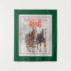 A tapestry with the saying: Sleigh bells ring. Designed with an outdoorsy photograph featuring a team of 2 belgian draught horses pulling a sleigh. Snowflakes gently falling down with snow covered pine trees in the background.