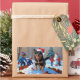 A heartwarming holiday illustration featuring a cheerful dog playing in the snow, wearing a Santa hat and surrounded by colourful gift boxes. In the background, children build a snowman beside a snow-covered Christmas tree, creating a joyful winter wonderland. Perfect for spreading holiday cheer and capturing the magic of Christmas.