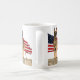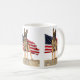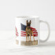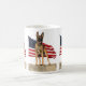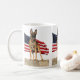 A Belgian Malinois in front of a waving American Flag on a mug.