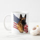 The beautiful and talented Belgian Malinois is highlighted in this headstudy with a waving American flag behind it. Show your pride in your dog breed and country~