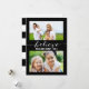 Your holiday greetings to friends and family will be unique using this elegant, simple holiday photo card design with the word "Believe" written in a popular, white script font on a black background with place holders for two family photos in a vertical card layout. Design by ELKE CLARKE© FOR MONOGRAM GALLERY. Replace sample photos with your own. Black and white striped pattern on the back of card can be changed or deleted. Other colours available in store or contact designer.
