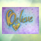 Inspirational word "Believe" is a golden yellow with matching yellow and orange hearts below the word. A pale blue background outlines the letters. The edges of the painting are in lavender and magenta colour washes. A light layer of glitter adds contrast and character to the painting.