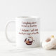 "Everybody should believe in something. I believe I'll have another cup of coffee." A funny coffee mug quote perfect for any coffee lover! Elegant handwritten style text over a stylised image of a steaming coffee cup and coffee bean in purple and brown.