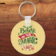 A keychain with a cool illustration. Text says Believe in the Magic in fancy lettering. Decorated with christmas balls.