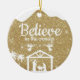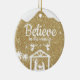 Believe in the wonder, Religious Holiday Ceramic Ornament with gold glitter sparkle, Nativity Scene capturing the Christmas magic and joy of a Christian season. On the back, the sacred writing, Luke 2:12 states, "And this shall be a sign unto you; Ye shall find the babe wrapped in swaddling clothes, lying in a manger" all in customizable text, ready for you create your favorite bible verse in festive devotional design hanging decorations. Order your Christ teachings testaments today and make your custom inspirational doctrine keepsakes extra special with divine passages of the word of our Lord! 🎄⛪️