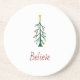 Believe Christmas holiday coaster with a colorful decorated evergreen tree design. A festive item for your holiday home decor and entertaining.