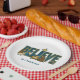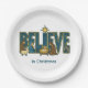 The word "Believe" with a beautiful nativity scene on a holiday plates containing the manger with baby Jesus, Mary, Joseph, a shepherd, sheep and a donkey. You can customize with your own quote. Great for Christmas parties or for Christian family and friend get-togethers over the holidays.