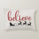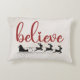 Pillow features the word "believe" in a red scripted font and includes Santa with his sleigh and reindeer in black silhouette and gold whimsical pixie dust underneath.