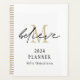 Believe Script 2024 Monogram Initial Name White. Keep yourself on track for the year ahead with this inspirational design with an encouraging word, Believe, in informal set script overlaid onto your initial in gold on a white background. Personalise with the year and your name. A coordinating gold is on the back.