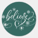 Believe Script | Green Christmas Snowflake Swirls Classic Round Sticker