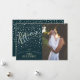 A whimsical handwritten script photo card design against a dark navy background and white falling snow.