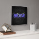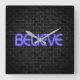 Illuminated urban brick wall with believe text in glowing neon lights.