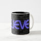 Illuminated urban brick wall with believe text in glowing purple neon lights.