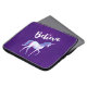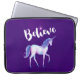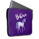 Laptop sleeve with a pretty watercolor unicorn painted in soft pastel watercolors of pink, purple and blue. Inspirational typography text says Believe in a trendy font with a star above the letter i. Set on a royal purple background.