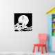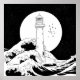 A black and white line art illustration of Bell Rock lighthouse in Scotland. Huge waves crashing around the base of the lighthouse.