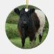 A Belted Galloway Cow, also known as the Oreo cow belties or Panda Cow, looks straight into the camera. Grazing here at Dartmoor National Park.