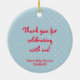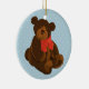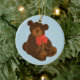 Round ceramic ornament with an image of an adorable stuffed teddy bear with a big red bow named Ben on a background of white polka dots on blue. Back has an image of white polka dots on blue and optional text. See the entire Kids’ Ornament collection in the PARTY FAVORS section.