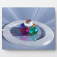 A 3D picture created in Vue, full of reflections and lights shining from all directions. Five colourful spheres of blue, pink, turquoise, orange, and diamond glass stand in a pyramid encircled by a translucent white ring. They sit on a mind-bending background of pale blue and white rays that converge right under the five crystal balls.