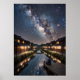 A peaceful village rests quietly under a crystal-clear night sky, where the majestic Milky Way stretches brilliantly across the cosmos. Stars shimmer and twinkle, their reflections dancing gently on the calm surface of a narrow canal. Traditional wooden houses line the water’s edge, warm light glowing softly from their interiors, inviting and serene. On a wooden dock, a lone figure sits contemplatively, gazing upward at the infinite expanse, lost in a moment of quiet wonder. The scene feels deeply emotional and cinematic, capturing the beauty of solitude and the vastness of the universe.