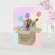 Bengal cat in generic cardboard box with balloons and confetti for 55th birthday