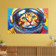 This digital artwork by Otis Porritt presents a striking Bengal cat peering from within an astronaut's helmet. Rendered with vibrant, saturated colours and bold outlines, the feline's emerald eyes captivate against its orange and black striped fur. The background explodes with a dynamic interplay of red, yellow, and blue, adorned with splatters and cosmic spheres, creating a lively, pop art-inspired universe. The crisp lines and graphic style emphasise the adventurous spirit of this unique space explorer.
