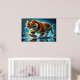 A majestic Bengal tiger, a symbol of untamed power, splashes through the shallow, turquoise ocean, sending bursts of white foam into the air. The tiger's powerful muscles ripple beneath its iconic orange and black stripes as it moves dynamically through the water. The scene captures the vivid blue of the ocean, the bright white of the splashing surf, and the sparkling sunlight, creating an image of exhilarating movement and raw energy. The soft, blurred ocean background emphasises the tiger's striking presence.