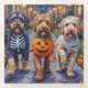 Adorable Bernedoodles dressed in playful Halloween costumes carry pumpkin buckets while trick-or-treating under the moonlit sky. This festive design highlights the breed’s fluffy tri-colour coat, affectionate nature, and playful charm, perfectly capturing the spooky yet fun atmosphere of Halloween night. A heartwarming celebration for dog lovers and Halloween fans alike.