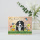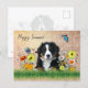 A fun dog and wildflowers postcard to send to a friend in spring or summer. A beautiful Bernese Mountain dog lies among colorful wildflowers in this design. His paws are in green grass, and bees and butterflies visit the blooms. "Happy Summer" text in script is easy to change, or delete. The back of the card also has a dog image but has no text. Drop a fun note to a friend who is just as happy about the upcoming warm summer!