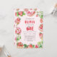 Berry 1st Birthday Pink Sweet Strawberry Girl Invitation. Strawberry 1st Birthday Party Berry Sweet Girl Pink Invitation, Adorable elegant watercolor fruity and floral strawberry themed berry first birthday party invitation template with elegant modern script, for baby girl turning one. Easy to customise birthday invitation featuring strawberry themed cupcakes, doughnuts and sweets and pattern on back side.