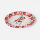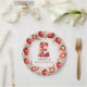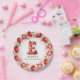 Celebrate in style with this adorable strawberry-themed round paper plate! The elegant border features a circular arrangement of hand-painted strawberries, with a mix of whole and sliced berries, delicate green leaves, and tiny white blossoms. At the centre, a beautifully illustrated letter "E" cake takes the spotlight, decorated with pink frosting, juicy strawberries, and a glowing birthday candle. The soft watercolor background blends seamless shades of blush and rosy pink, creating a festive and charming atmosphere. Perfect for strawberry-themed birthdays, fruit lovers, and summer celebrations. Pair with matching invitations and party decor for a coordinated look!