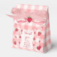 Wrapped in a classic red and white gingham print, strawberries and adorned with dainty watercolor bows, these favor boxes bring a sophisticated coquette-meets-picnic vibe to your party tables.