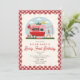 Strawberry themed "berry first" birthday featuring illustration of farmer's market camper decorated with gingham bunting and red balloons with picnic table and strawberry birthday cake. Border and reverse are red gingham.