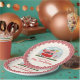 "Berry First Birthday" strawberry themed first birthday party theme featuring illustration of strawberry farmer's market trailer decorated with balloons, bunting, and a birthday cake on picnic table. Border is red gingham.