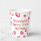 This cute "Berry First" red hearts and strawberries hand painted watercolor illustration themed paper cup with personalizable text is perfect for a 1st bday party. It features red hearts and hand-drawn strawberry motifs on a white background and text that you can customise with your own details. The template is customisable in the listing editor.