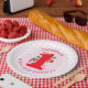 This berry first birthday design features a giant red number one surrounded by watercolor strawberries and blossoms in pink and red with green leaves on a pink circle against a pink plaid background. You can modify the name and the event. See the whole matching collection.