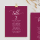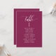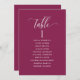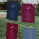 Help your guests find their table with this elegant modern seating plan cards with guests names. Double sided cards so guests can look from both, front or back for their names. Clear space all around giving you the liberty to use clips or punch hole for hanging displays, or use table holder/frame. Berry background and white text. Modern hand written calligraphy details. Several colour options. Have all table numbers in same colour or mix colours according to your event's colour theme. Part of our "Berry, Blue and Burgundy Floral" collection.