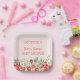 A sweet Baby Shower paper plate with a summer berries theme. This 'Berry Sweet' plate features a sweet pink background and strawberries and blooming strawberry plants. It includes elegant serif font for a charming touch. The design is fully customisable with event details, making it perfect for a spring or summer baby shower.