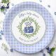 So berry sweet baby is on the way! Paper plates for a baby shower and any summer event, in modern farmhouse style, featuring blueberries, greenery and light blue plaid pattern. Easily personalise the text. - Kate Eden Art