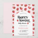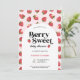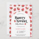 Berry Sweet Baby Shower Invitation, designed with a pink and red strawberry and daisies pattern, a white arch frame, and a retro typography that combined make a modern baby shower invitation for your summer baby shower celebration. It is a great baby shower theme for a gender-neutral baby shower. Look for our matching enclosure cards with the same design in our collection.