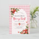 A berry sweet strawberry arch summer 1st birthday invitation featuring a charming pink gingham pattern and an arch frame with watercolor strawberries and leafy vines for your party details. The design blends sweet farmhouse charm with fresh summer style, perfect for a girl’s first birthday, strawberry theme party, or berry patch celebration.