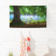 A peaceful summer afternoon beside a still lake, looking out from beneath the shade of a red maple tree with its branches and green leaves overshadowing the water's edge. Water lilies float on the shining surface, and a stork stands motionless in the water, while dragonflies and butterflies dance among the irises and cattails lining the bank. Sunlight glints and sparkles off the little ripples out in the lake.