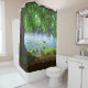 A peaceful summer afternoon beside a still lake, looking out from beneath the shade of a red maple tree with its branches and green leaves overshadowing the water's edge. Water lilies float on the shining surface, and a stork stands motionless in the water, while dragonflies and butterflies dance among the irises and cattails lining the bank. Sunlight glints and sparkles off the little ripples out in the lake.